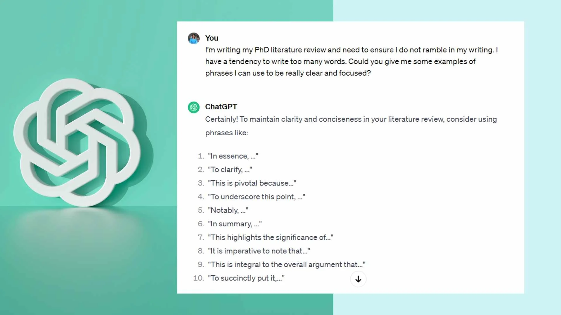 In conclusion, ChatGPT can be a powerful ally for social sciences Ph.D. students in refining their literature reviews. From providing helpful sentence starters to assisting with structural organization and proofreading, ChatGPT complements your skills without compromising the integrity of your work. As technology continues to advance, it's important for Ph.D. candidates to embrace ethical and transparent practices in utilizing these tools to enhance their academic endeavors.