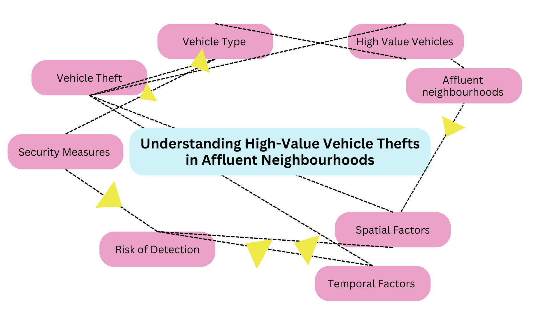By incorporating these additional factors into our conceptual framework, we can develop a more comprehensive map of all the important things about high-value vehicle thefts in affluent neighbourhoods. This framework will guide our data collection, analysis, and interpretation as we seek to address the research questions outlined in our study.