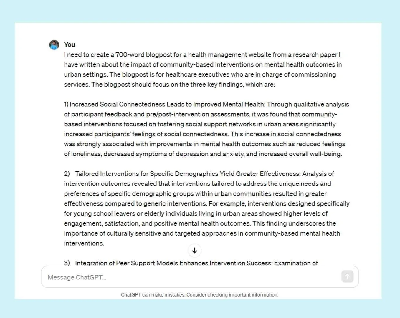 Whether you're transforming conference papers into blog posts or distilling complex findings for social media, ChatGPT can help. Provide it with your research insights, and watch as it generates a draft tailored to non-academic readers, complete with suggestions for enhancing relevance and appeal.