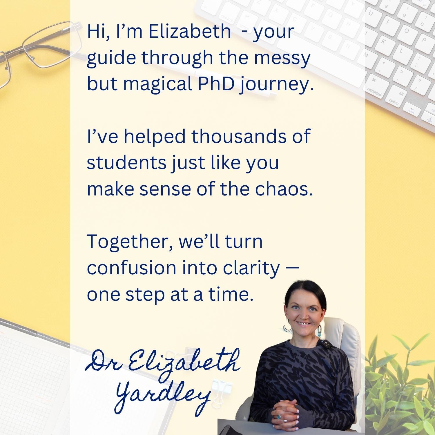 I’m Dr Elizabeth Yardley. After 20 years helping PhD students get unstuck, I created these PhD Survival Guides to simplify the hardest bits of your thesis and give you practical next steps - no jargon, no fluff.